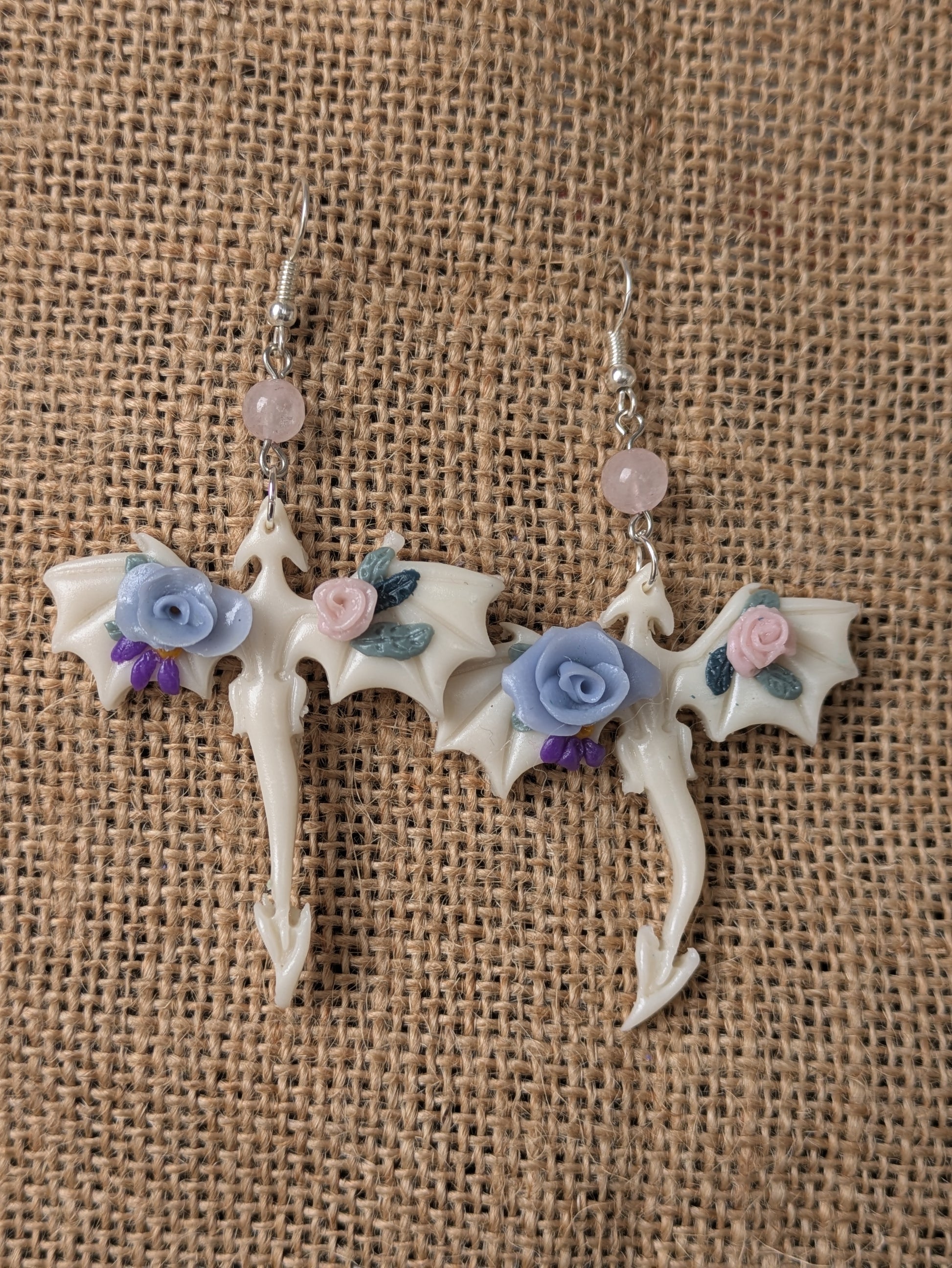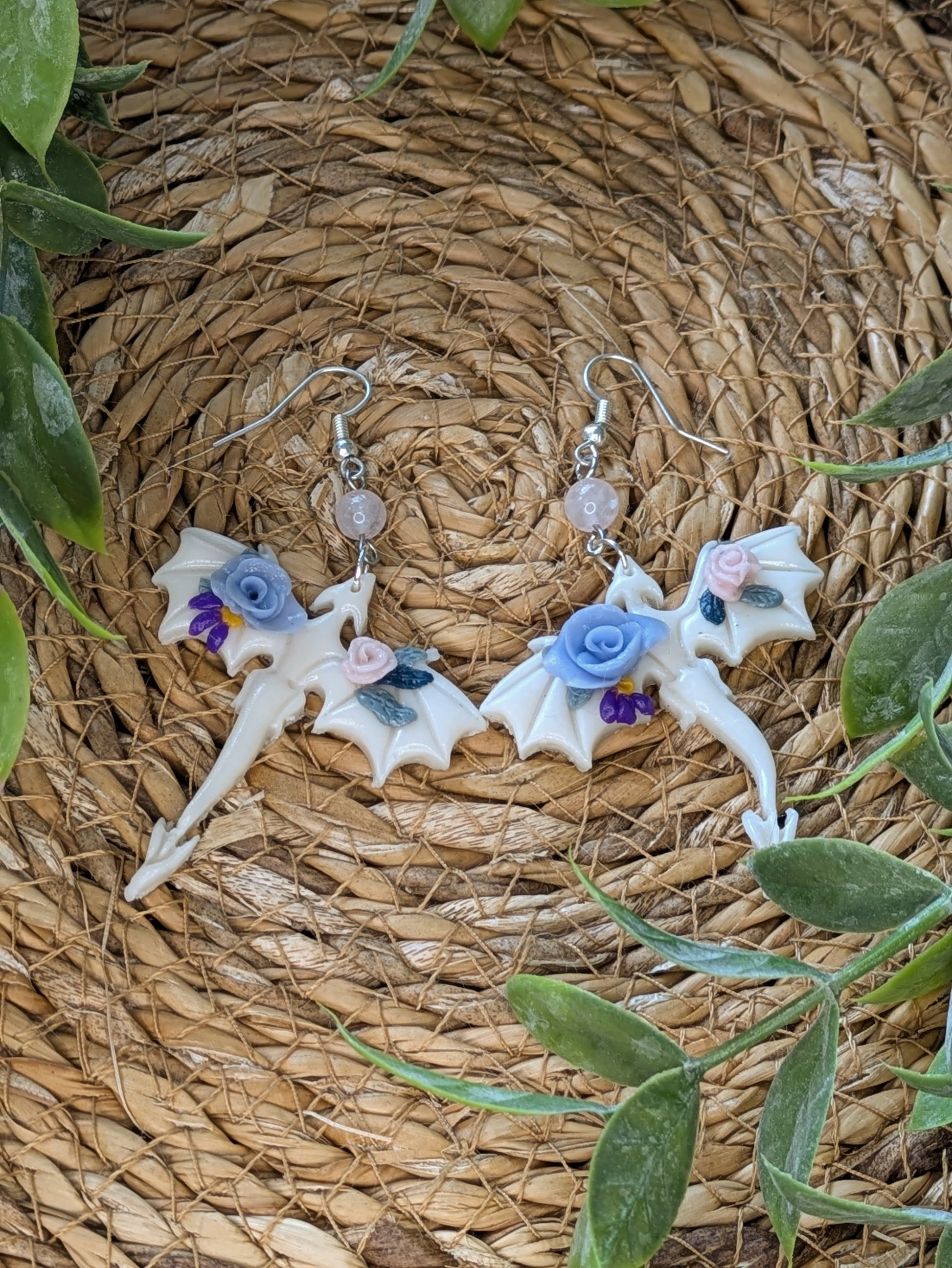 Dragons blancs en pâte polymère décorés de fleurs bleues, roses et violettes, avec un quartz rose au cœur. Attaches en acier inoxydable. Une touche florale et magique à porter au quotidien.