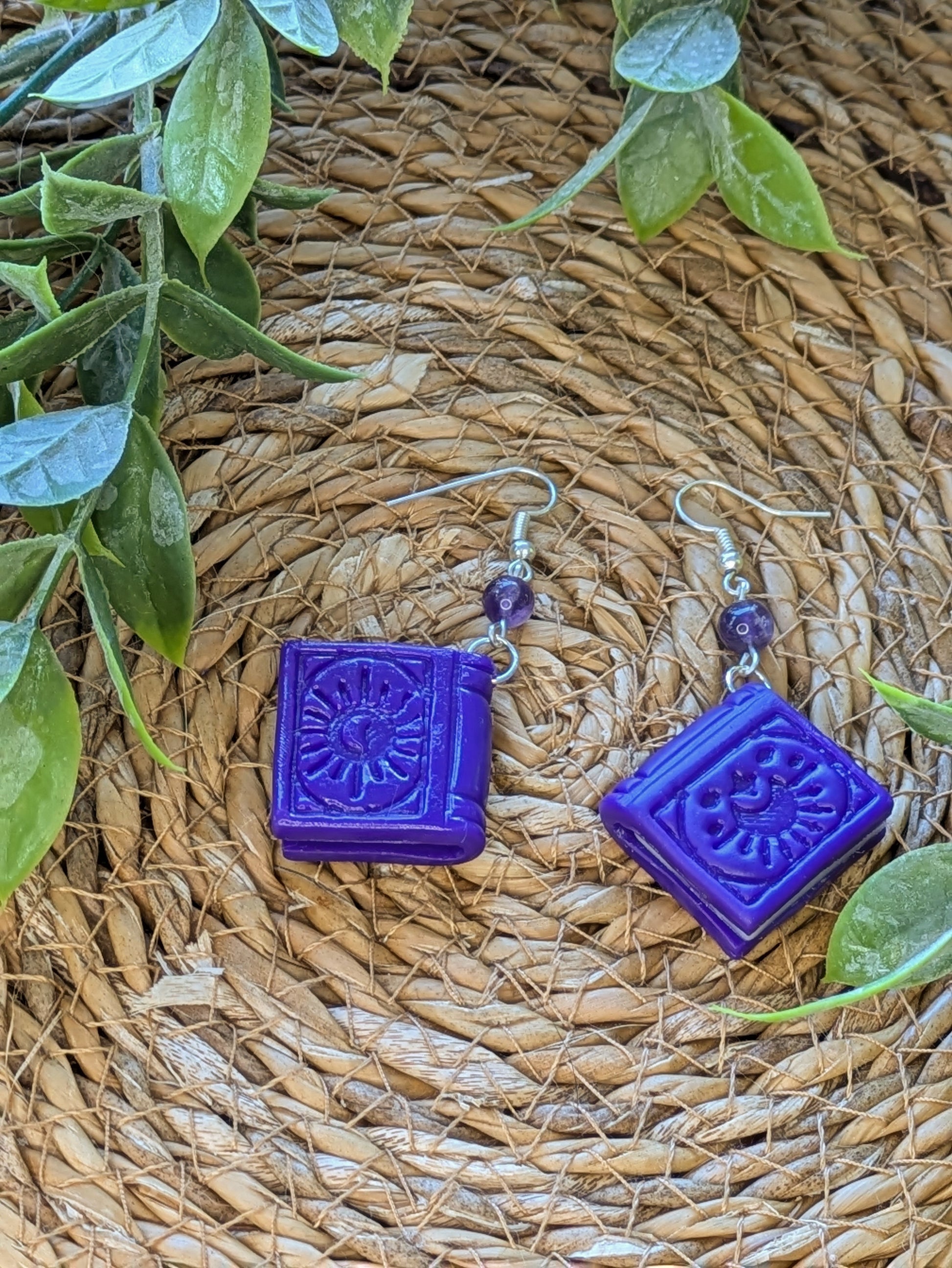 Boucles d’oreilles en pâte polymère violette en forme de grimoires anciens, ornées de détails sculptés et surmontées d’une améthyste naturelle. Chaque grimoire semble renfermer un secret oublié. Crochets en acier inoxydable. Pour celles qui écoutent la magie murmurer entre les pages.