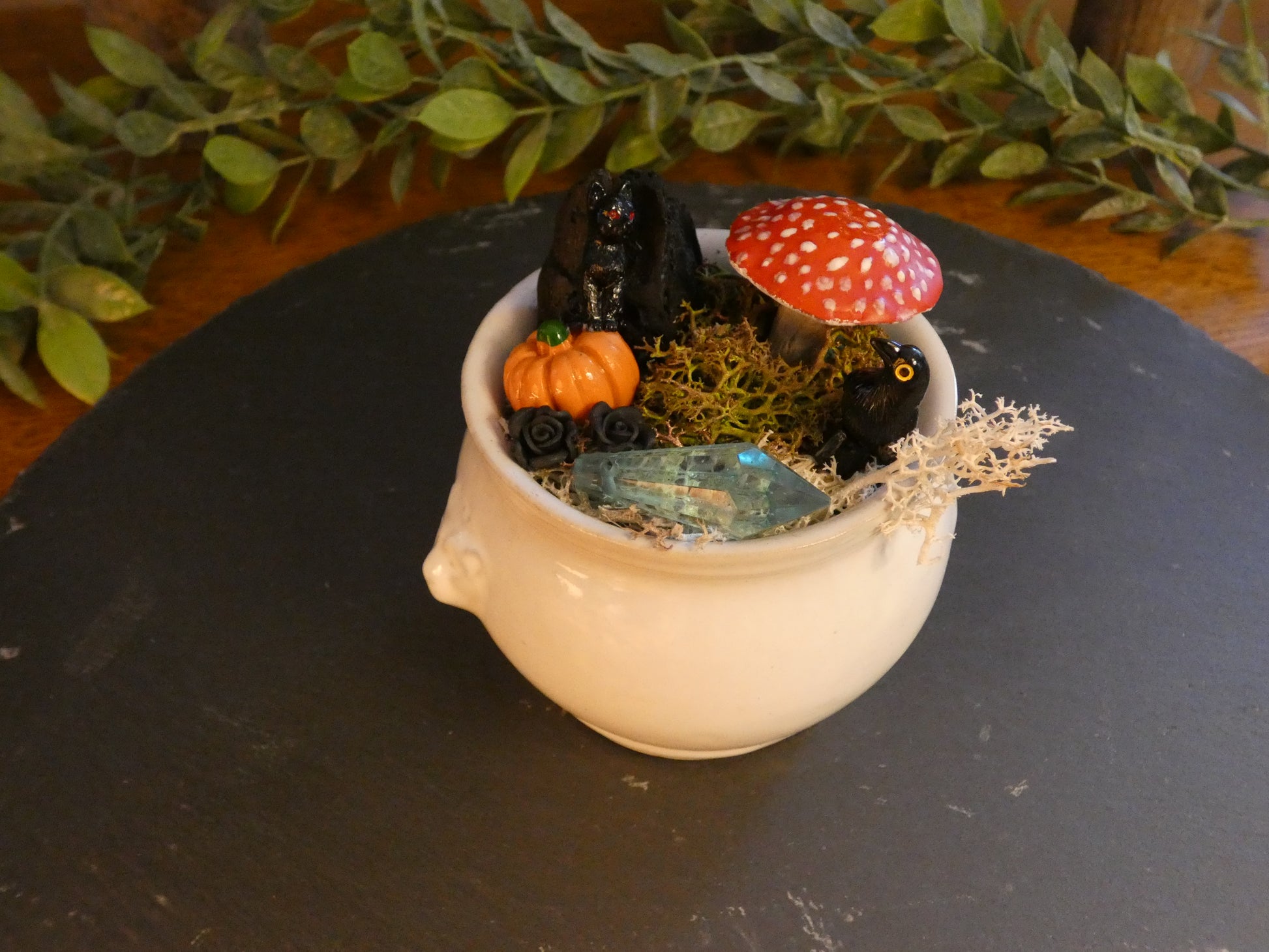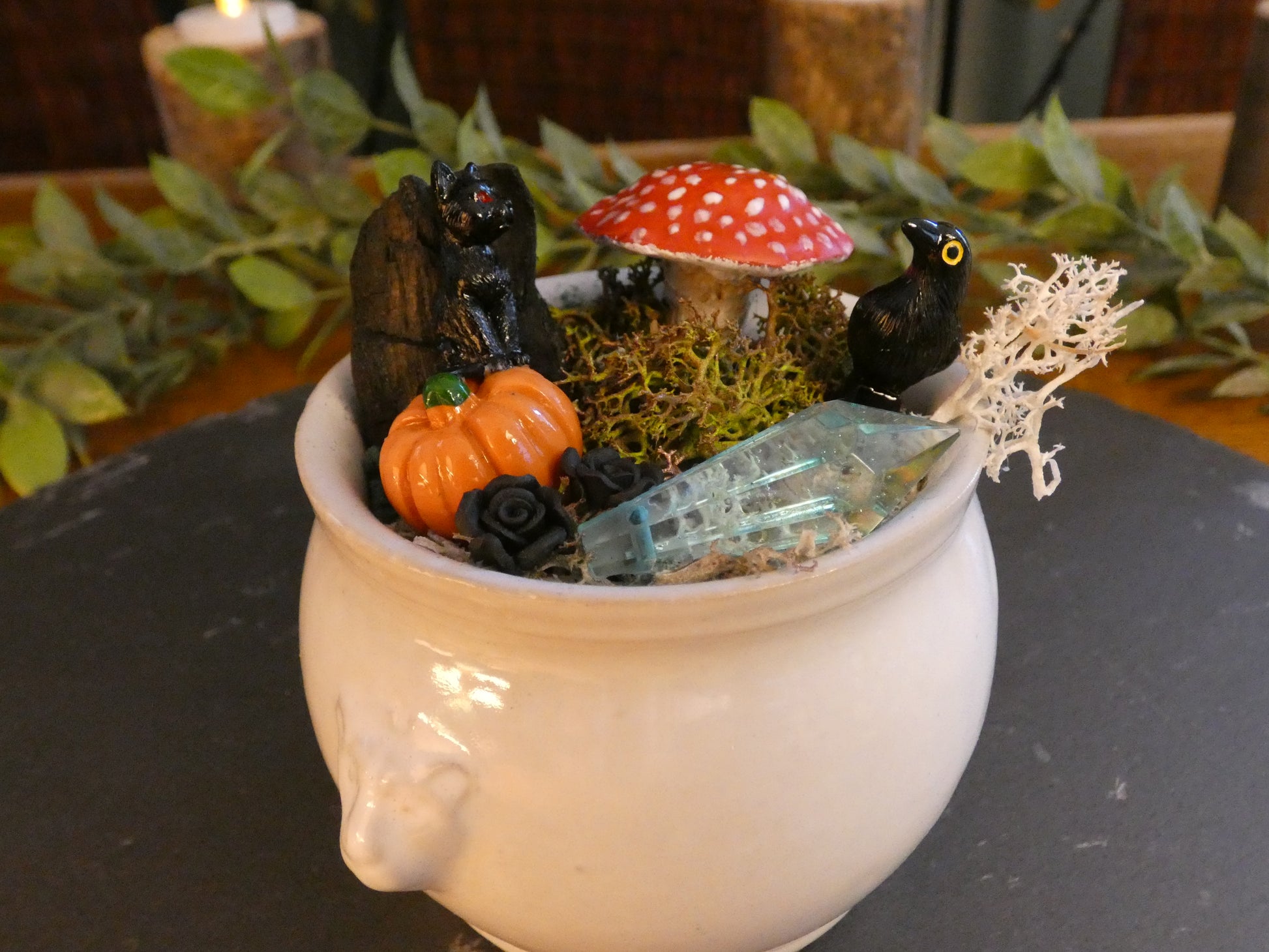 Sous la lueur pâle d’un cristal bleu, un chat noir et un corbeau montent la garde autour d’un petit autel mystérieux. Entre la citrouille, l’amanite et les roses noires, la scène semble figée à l’instant précis où la magie de la nuit s’éveille.