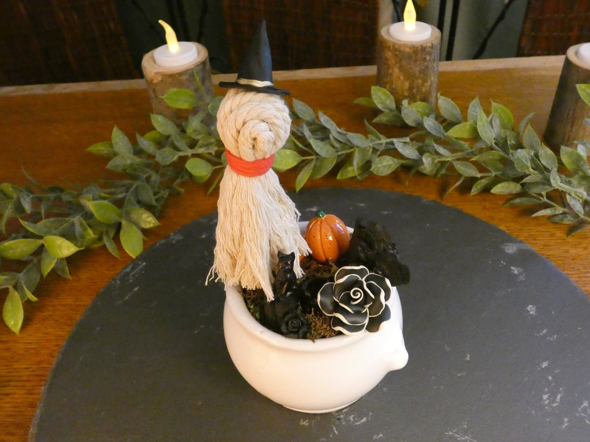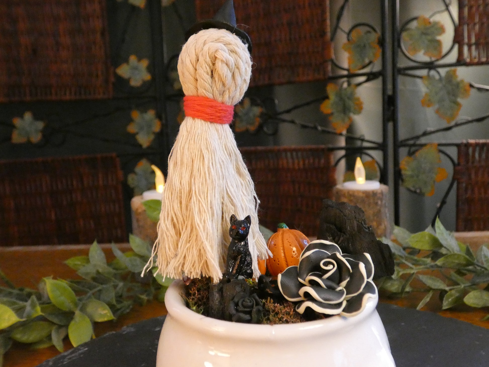 Au cœur du jardin d’automne, un épouvantail fantôme veille paisiblement, le chapeau de sorcier légèrement penché sous la brise. À ses pieds, un chat observe le monde depuis son rocher, entre la lueur d’une citrouille et l’éclat d’une rose immense.